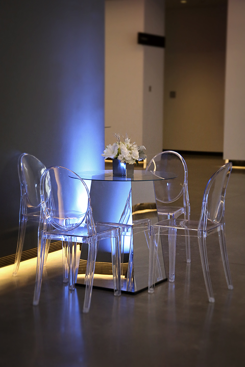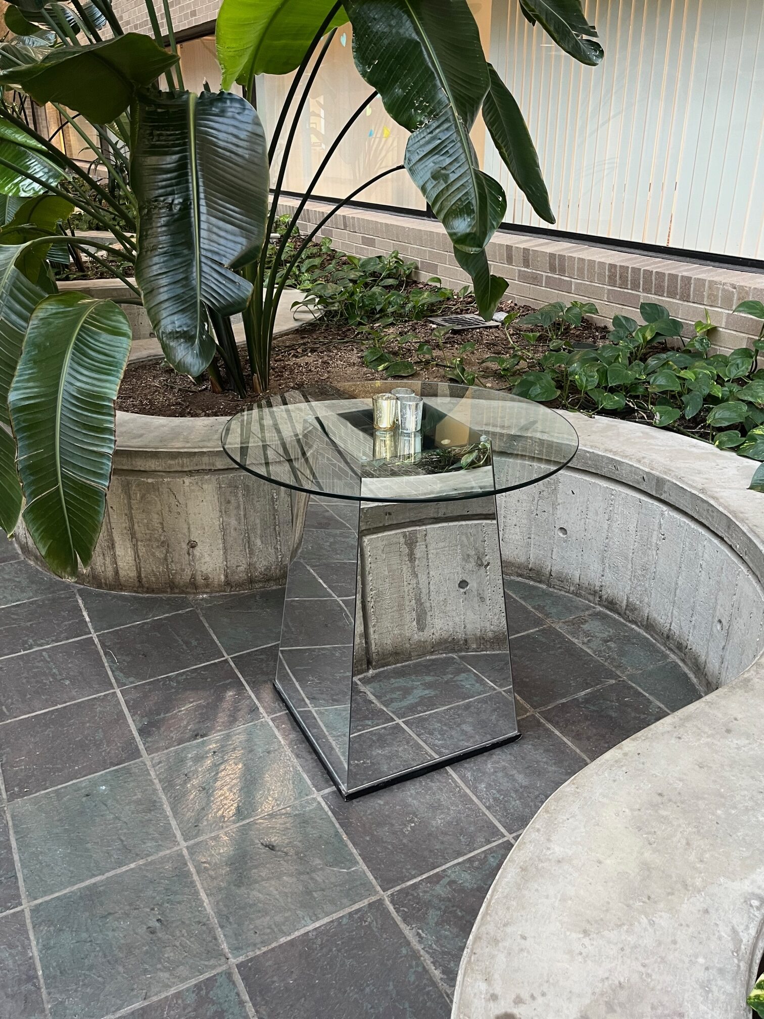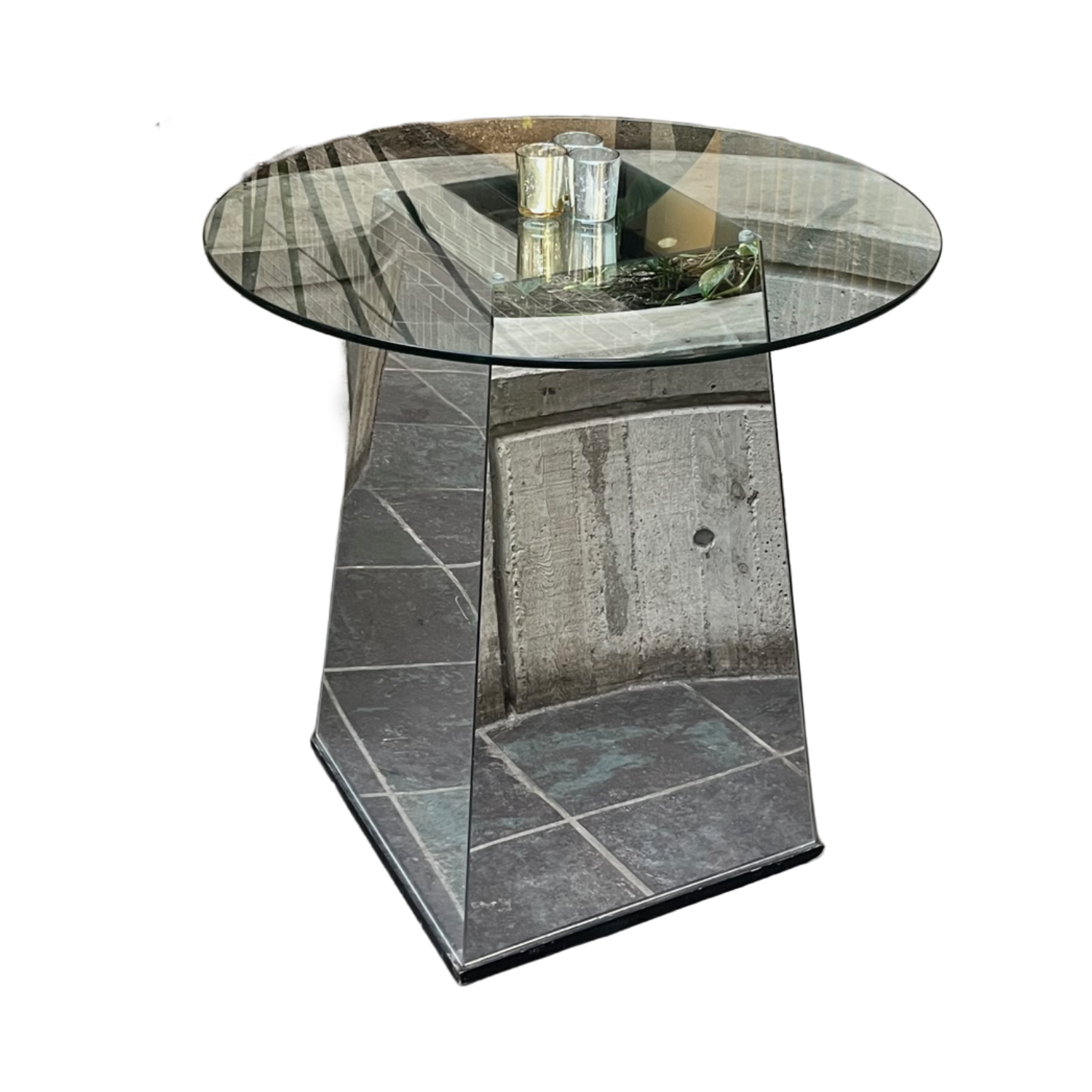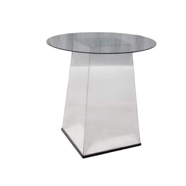 This stunning contemporary dining table features a round glass top supported by a dramatic mirrored geometric pedestal base that creates captivating reflections and visual depth. The sleek mirror finish and modern angular design bring sophisticated glamour and contemporary elegance to intimate dining settings.