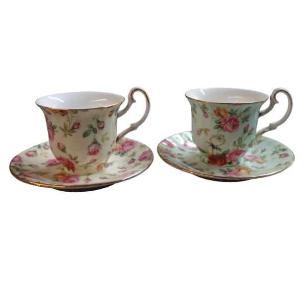 This porcelain teacup and saucer set features a classic footed cup silhouette with gently flared rim, elegant curved handle, and coordinating saucer, finished in soft ivory glaze adorned with romantic floral patterns in pink, blush, and green tones, accented by delicate gold trim along the rim and edges, offering timeless vintage charm and refined tea service elegance.
