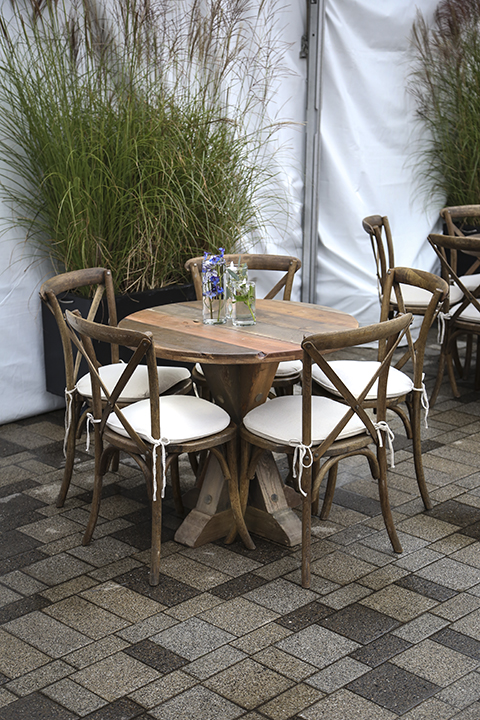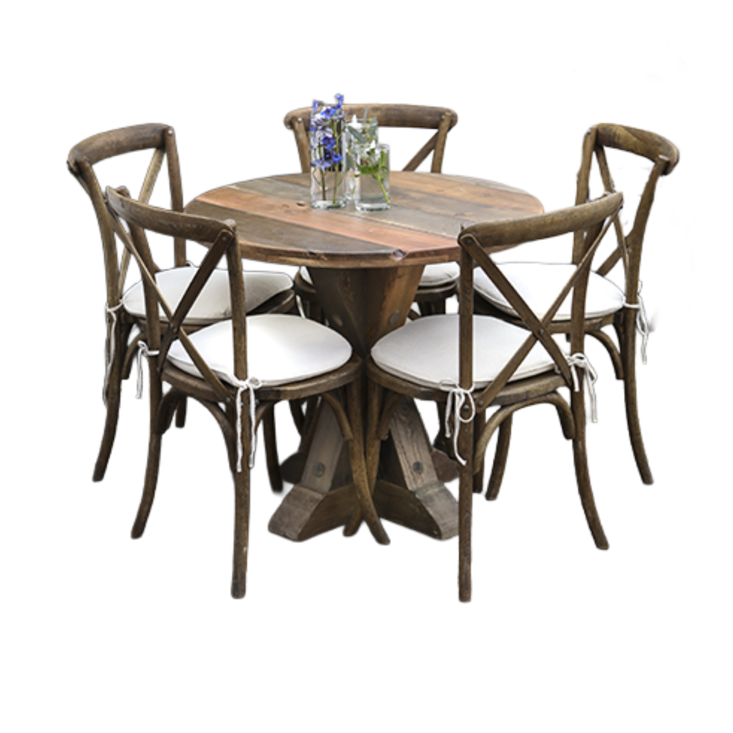 This rustic dining table features a beautiful round reclaimed wood plank top with natural grain variations and a distinctive crossed wooden pedestal base. The weathered farmhouse finish and substantial construction create an inviting centerpiece perfect for intimate gatherings and family-style dining.