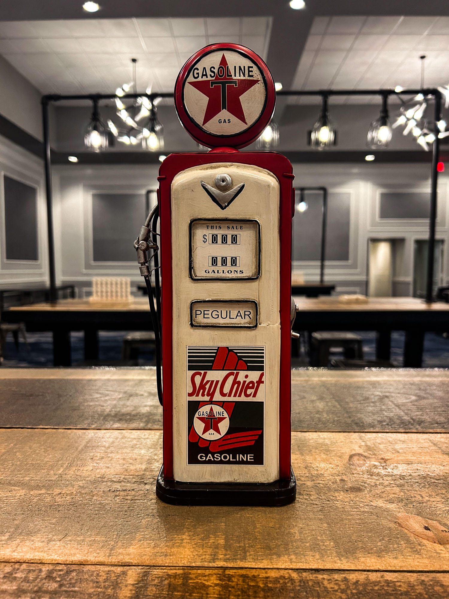 This vintage-style miniature gas pump features classic Texaco Sky Chief branding, distinctive red star logo, working dial displays, and authentic retro detailing.