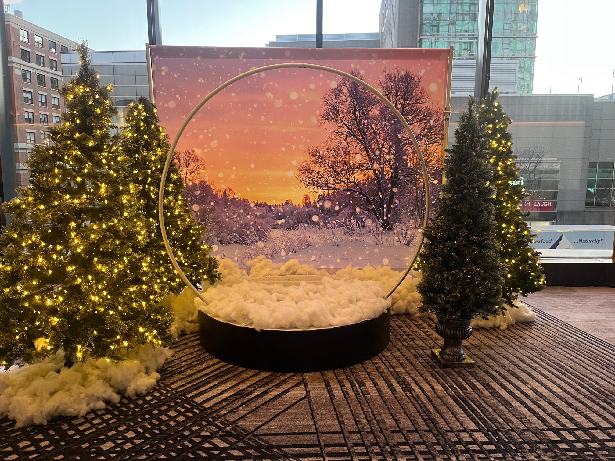 This immersive winter wonderland photo installation features oversized circular gold frame creating snow globe effect, scenic winter sunset backdrop with bare trees and snow-covered landscape, falling snow visual elements, dramatic pink and orange twilight sky, fluffy white batting creating snow drifts on black platform base, flanking illuminated evergreen trees with warm white lights, and enchanting seasonal photo experience offering Instagram-worthy moments and magical holiday atmosphere.