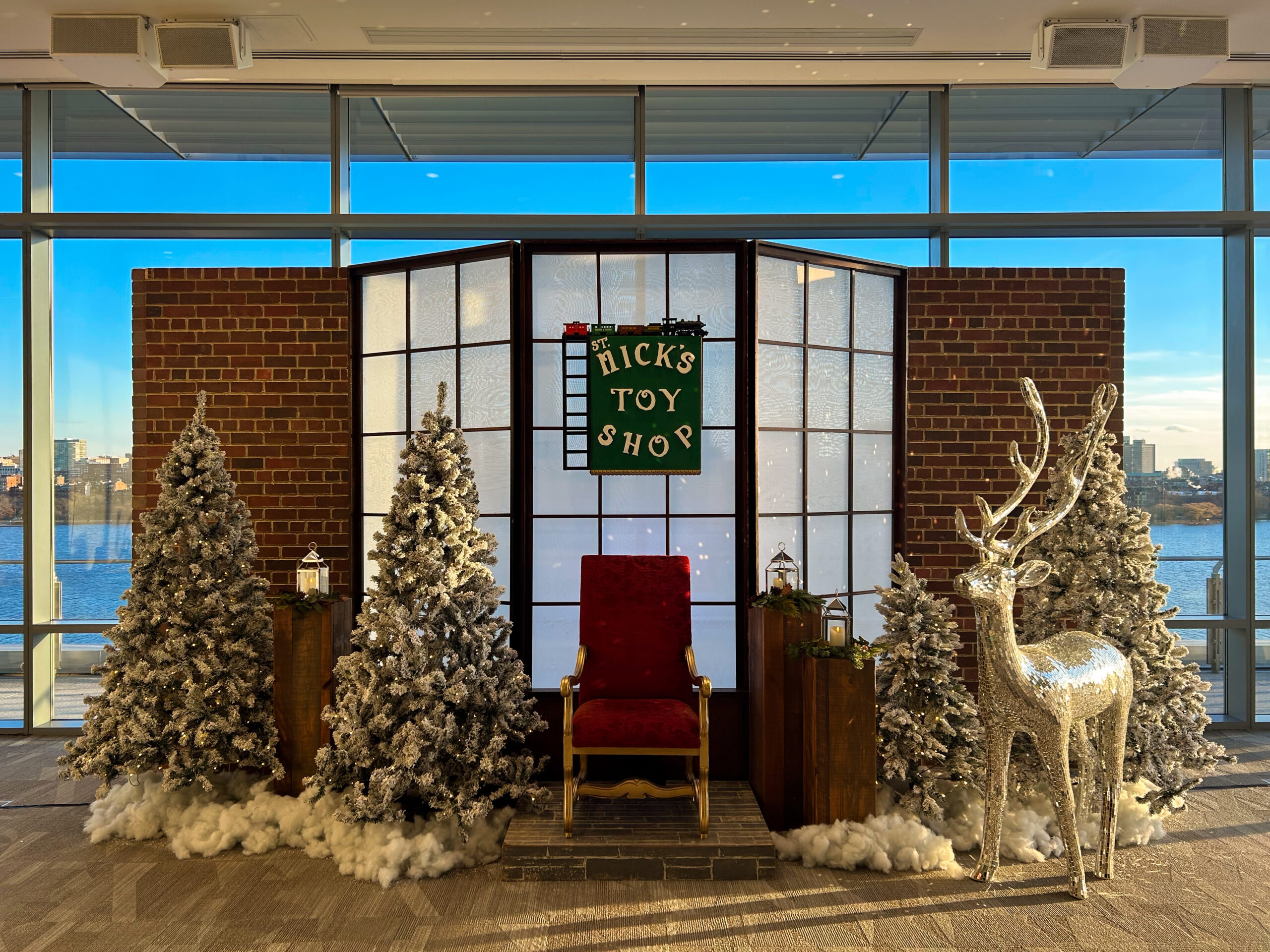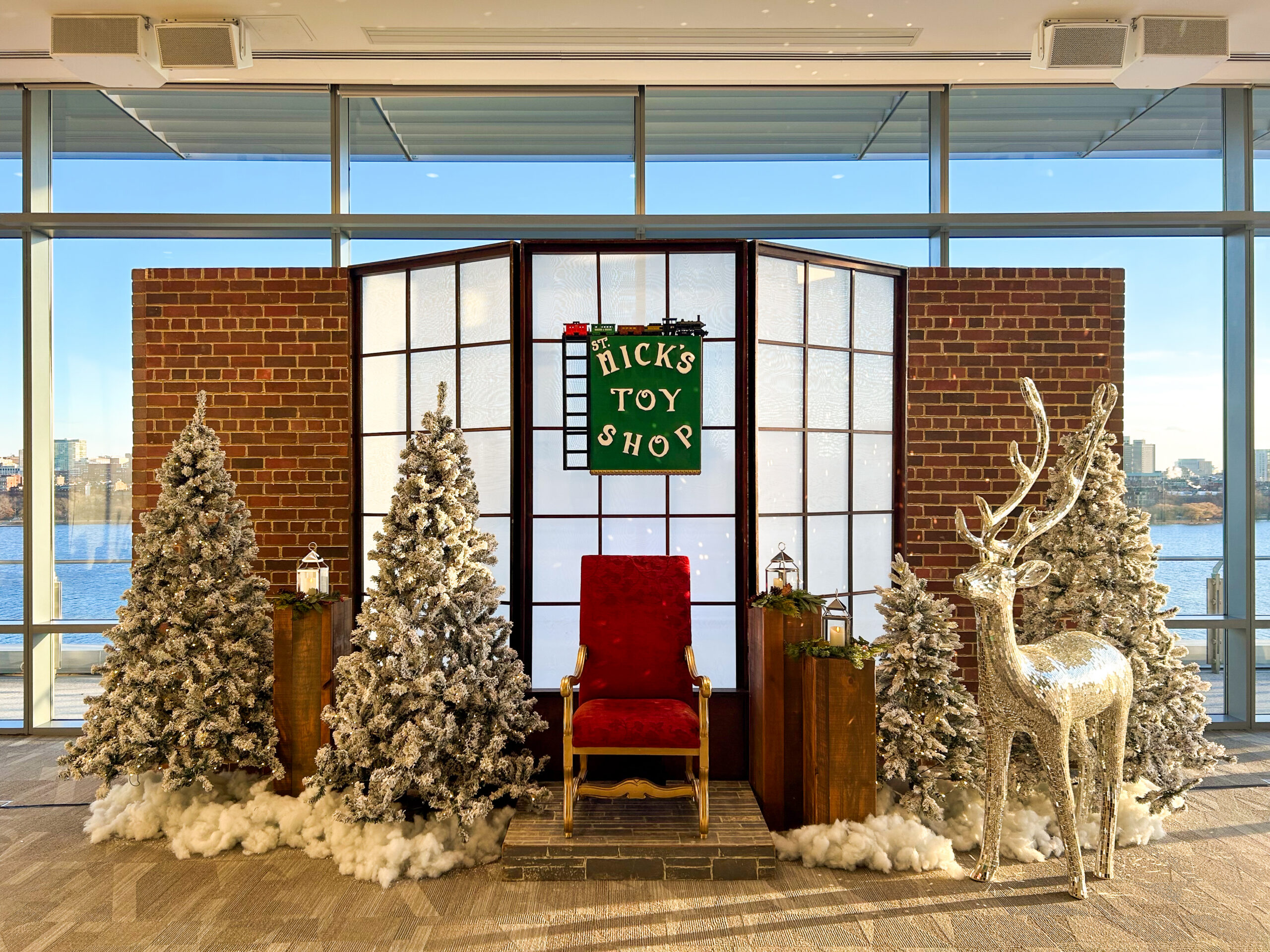 This St. Nick’s Toy Shop facade features authentic red brick masonry walls, large multi-pane windows with dark frames and frosted glass panels, prominent green and gold “St. Nick’s Toy Shop” hanging signage, luxurious red velvet throne chair with gold frame, flocked white Christmas trees with warm lighting, elegant white reindeer sculpture, rustic wooden lantern displays on crate pedestals, fluffy white snow base, and enchanting North Pole workshop character for magical holiday photo experiences.