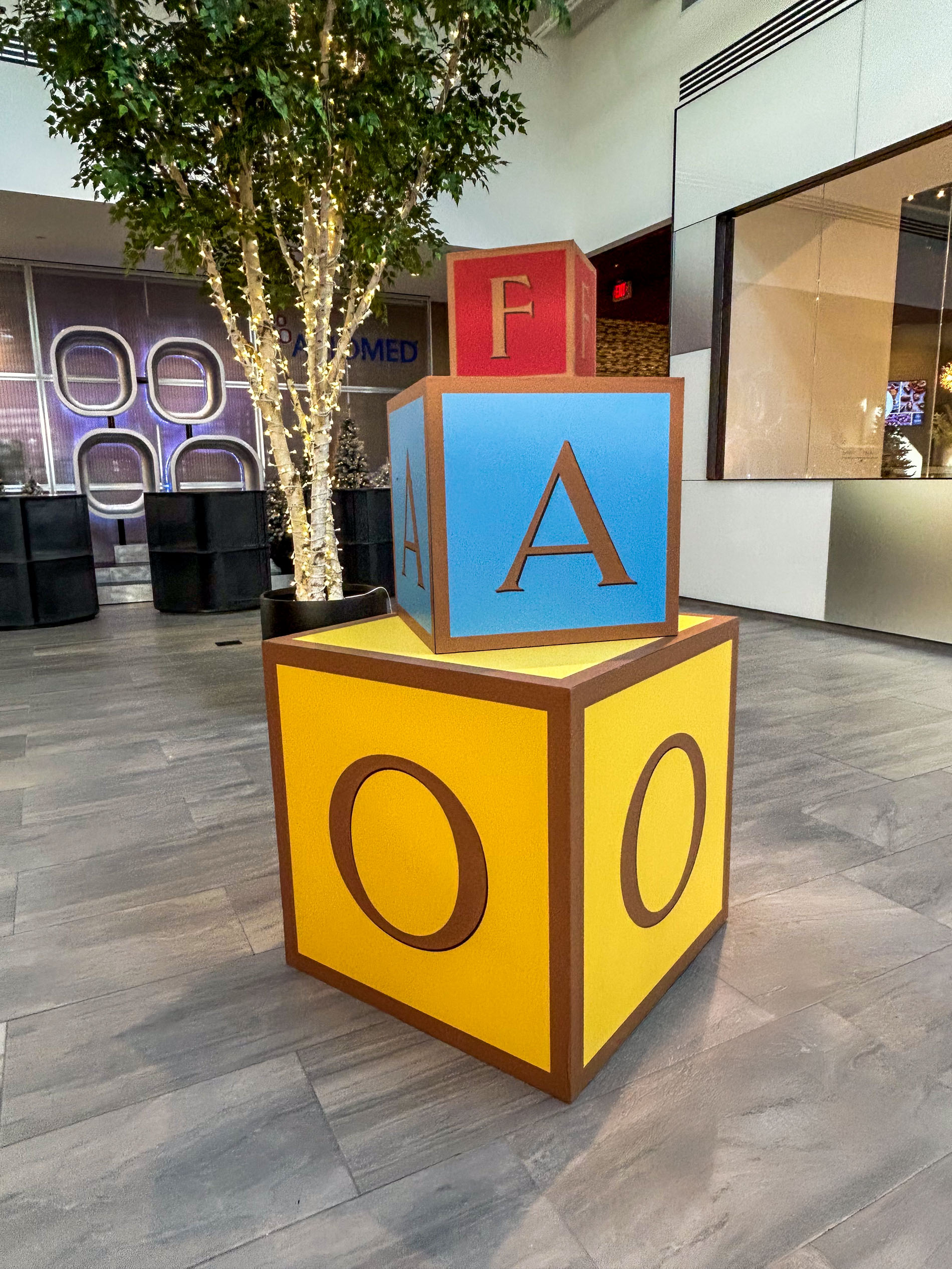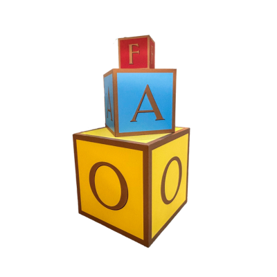 This whimsical oversized alphabet block set features three stackable cubes in vibrant primary colors with bold letter graphics and warm wood-toned trim. The playful design includes a large golden yellow base block, sky blue middle block, and coral red top block, creating an eye-catching sculptural element that evokes childhood nostalgia and adds instant charm to any space.