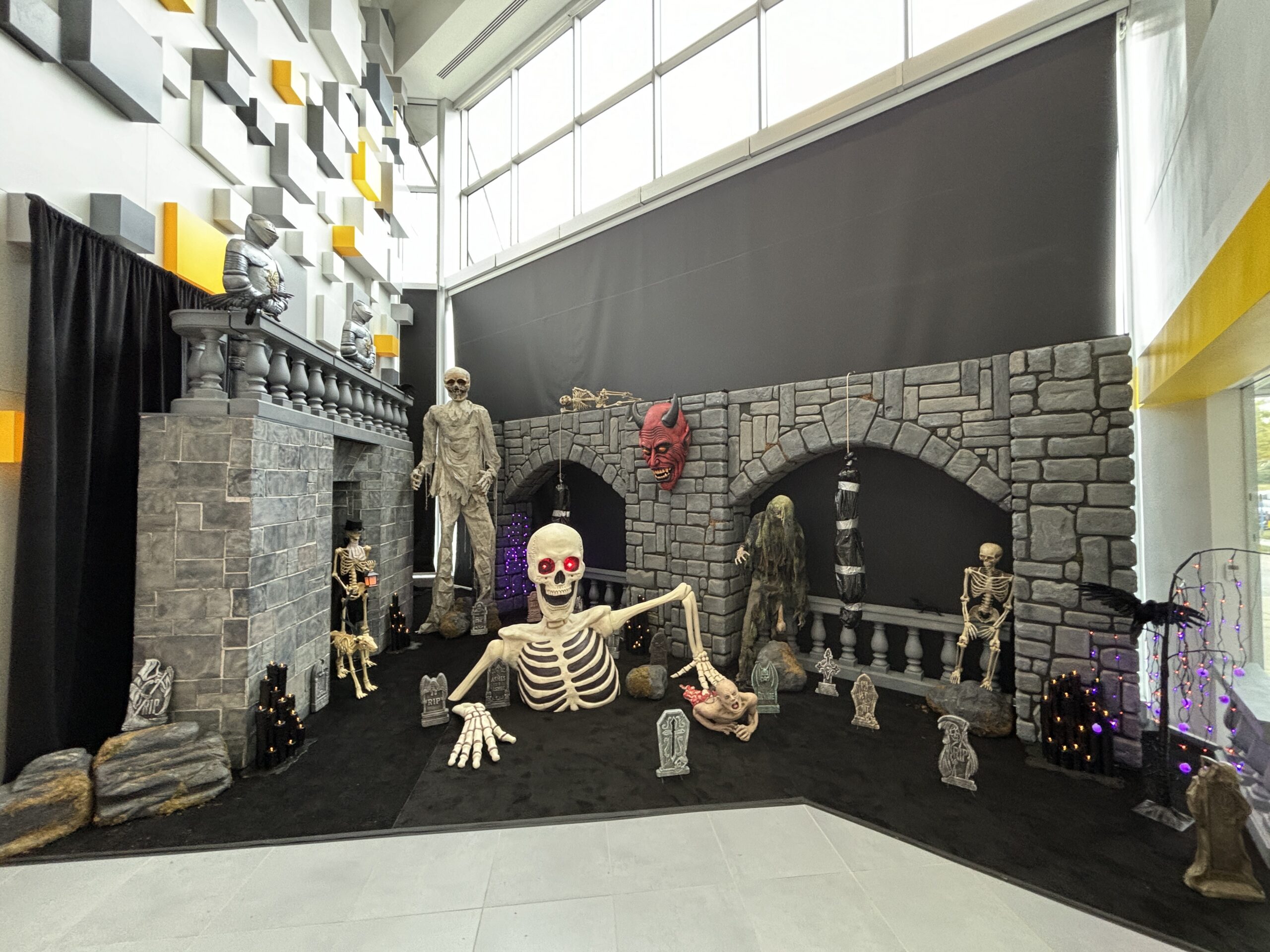 This medieval castle facade features authentic gray stone block construction with varied rectangular masonry patterns, dimensional corner turrets, dramatic arched entryways with keystones, crenellated battlements, and imposing fortress character, offering versatile gothic castle atmosphere for themed events, theatrical productions, and immersive fantasy environments.