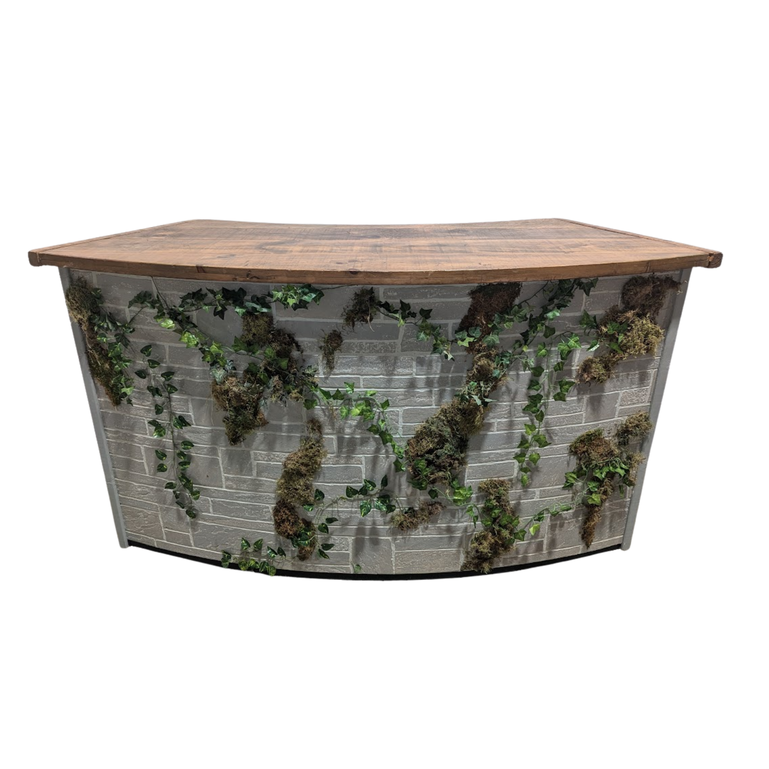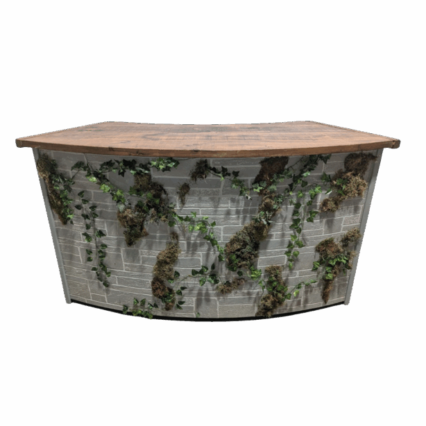 The Stone With Greenery Bar blends rustic charm with natural elegance, featuring textured stone-effect paneling adorned with cascading ivy and moss. This enchanting bar brings organic beauty and woodland sophistication to any venue.