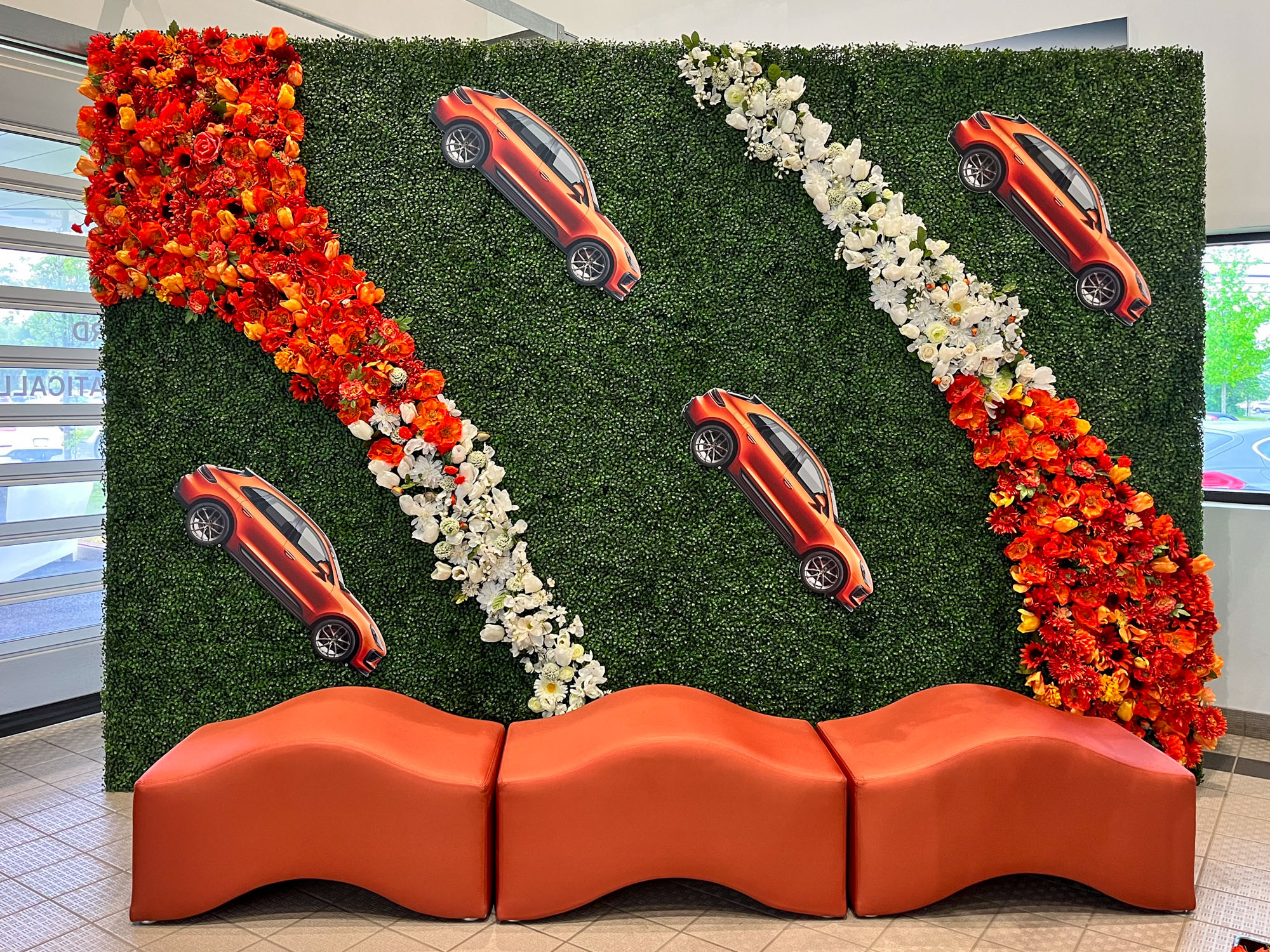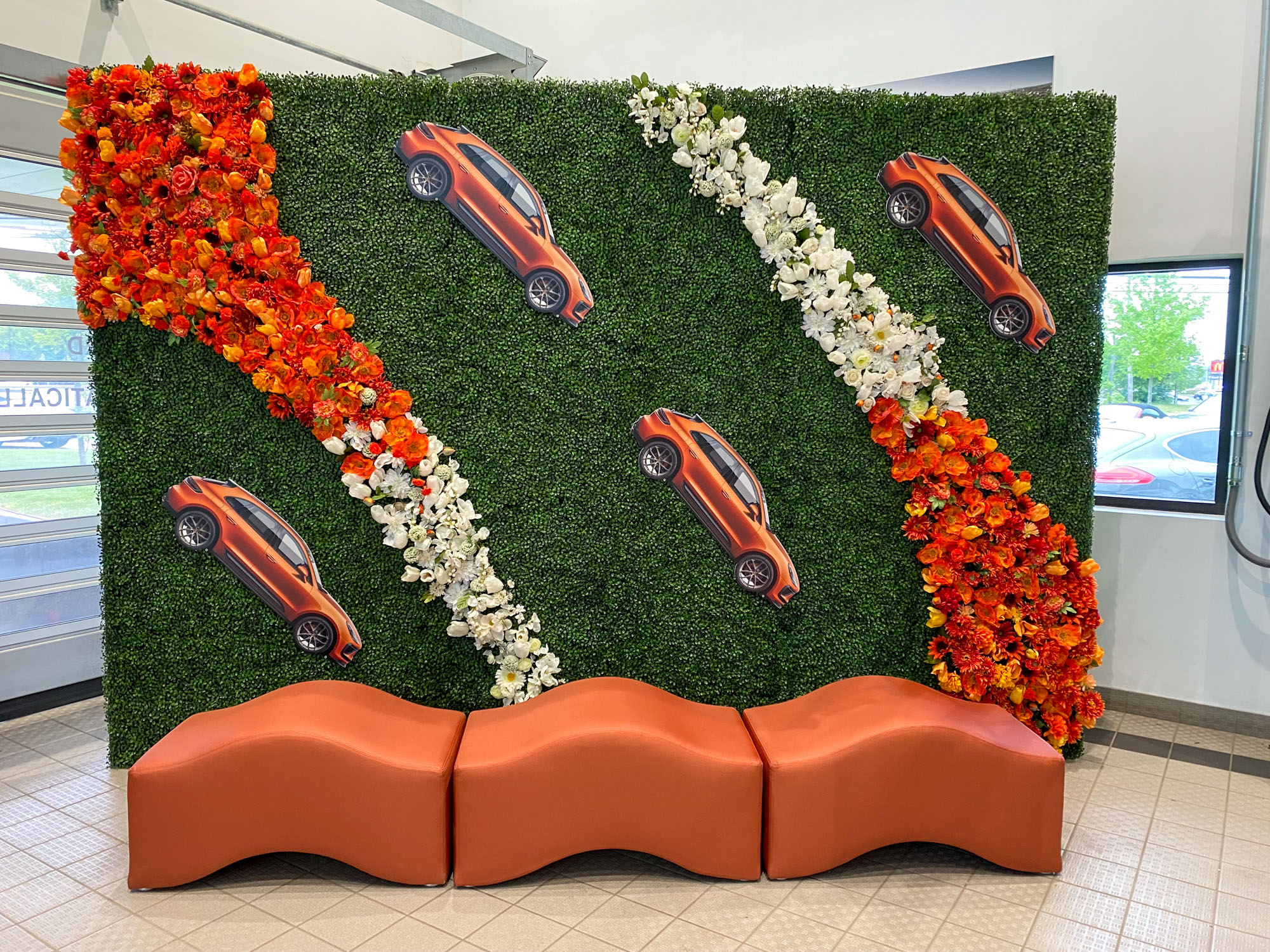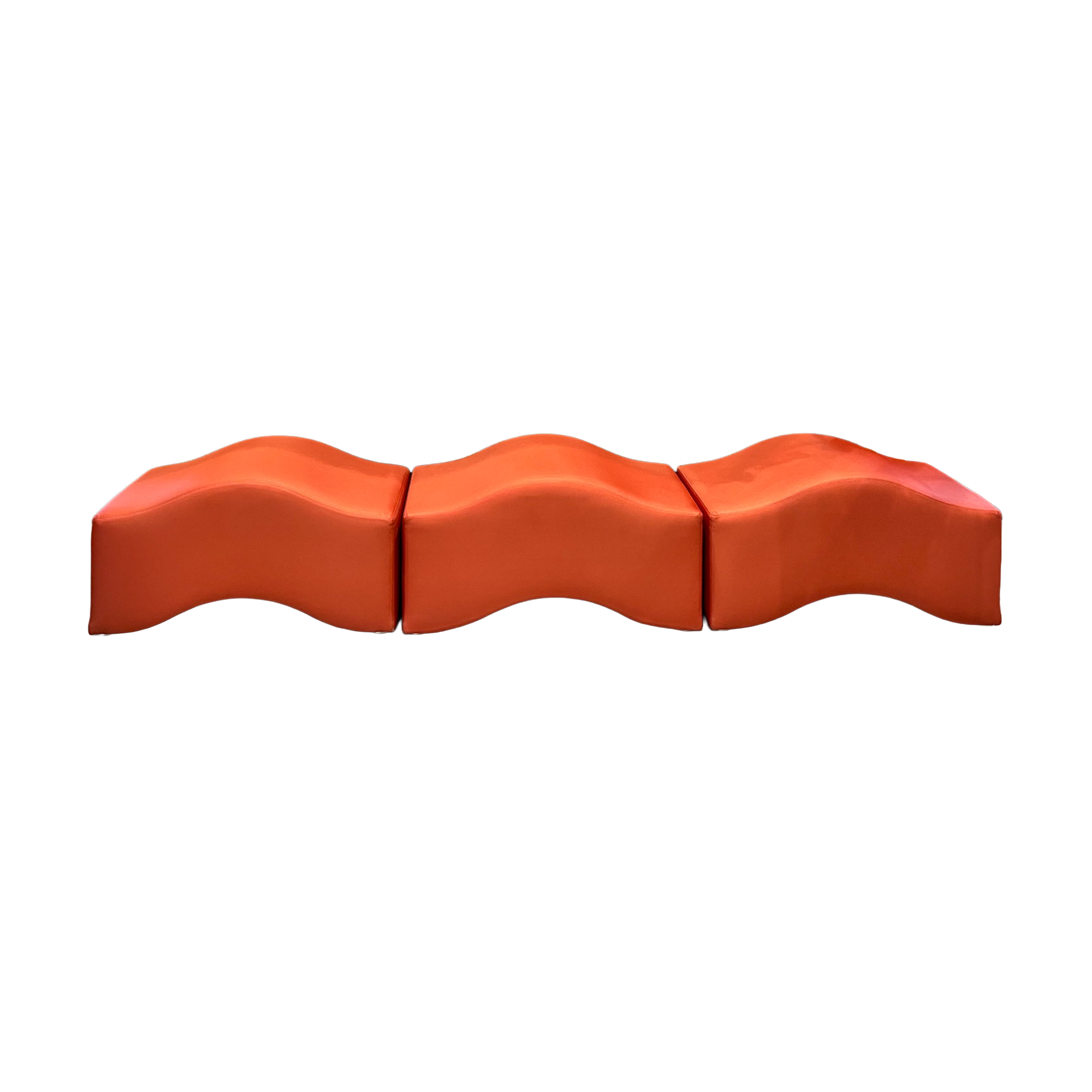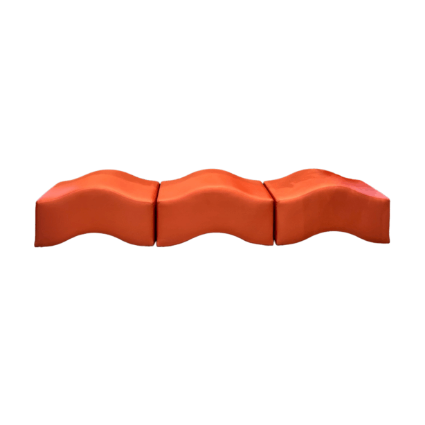 This innovative modular bench features vibrant tangerine orange upholstery with undulating wave-shaped cushions that create dynamic sculptural seating. The playful modern design with flowing curves adds visual interest to contemporary event spaces.