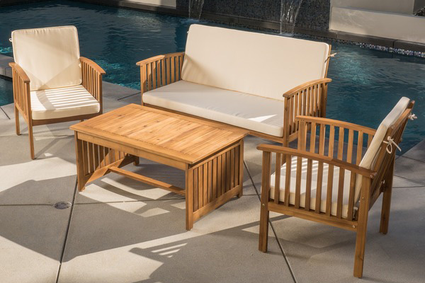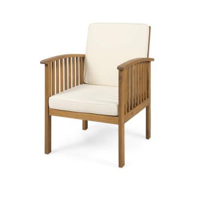 This elegant teak armchair showcases mission-style craftsmanship with distinctive slatted arms and a sturdy wooden frame complemented by plush ivory cushioning on the seat and back. The vertical slat detailing provides architectural charm while the warm natural teak finish contrasts beautifully with crisp white upholstery, creating a timeless piece that combines classic design with inviting comfort.