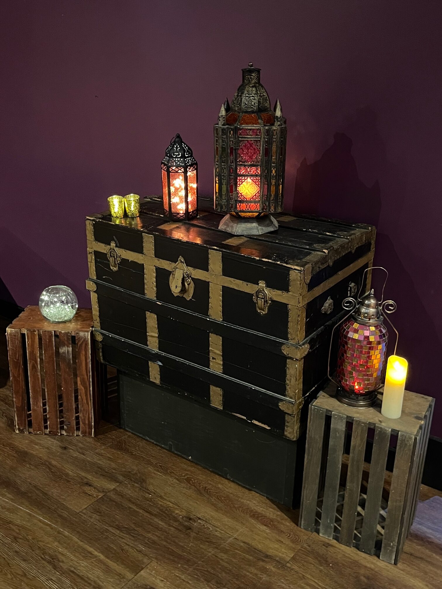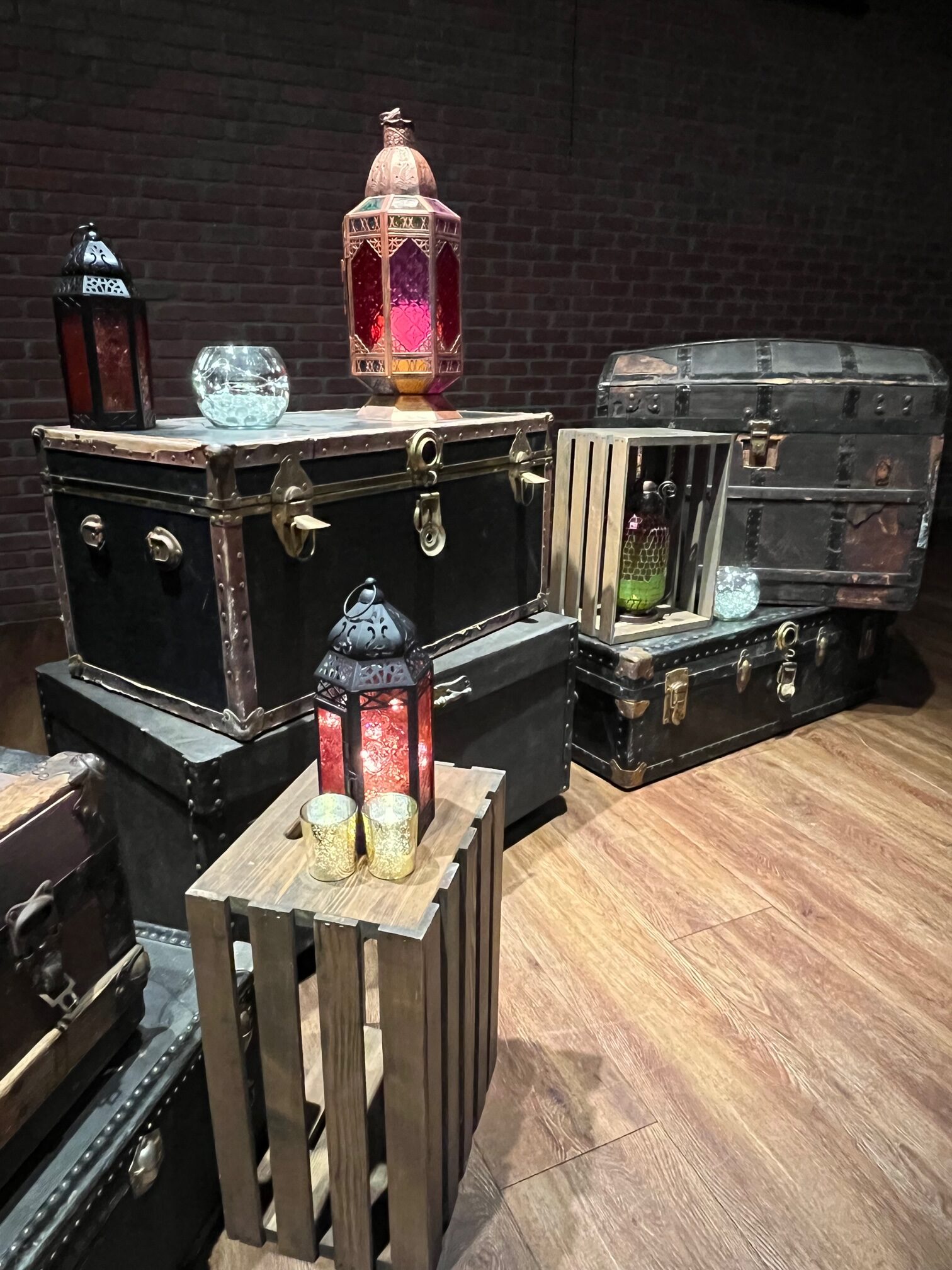 These vintage trunks in varying sizes and finishes bring timeless travel charm with brass hardware and authentic period detailing. The versatile collection creates dimensional displays when stacked or arranged, adding explorer ambiance and functional storage styling to any setting.