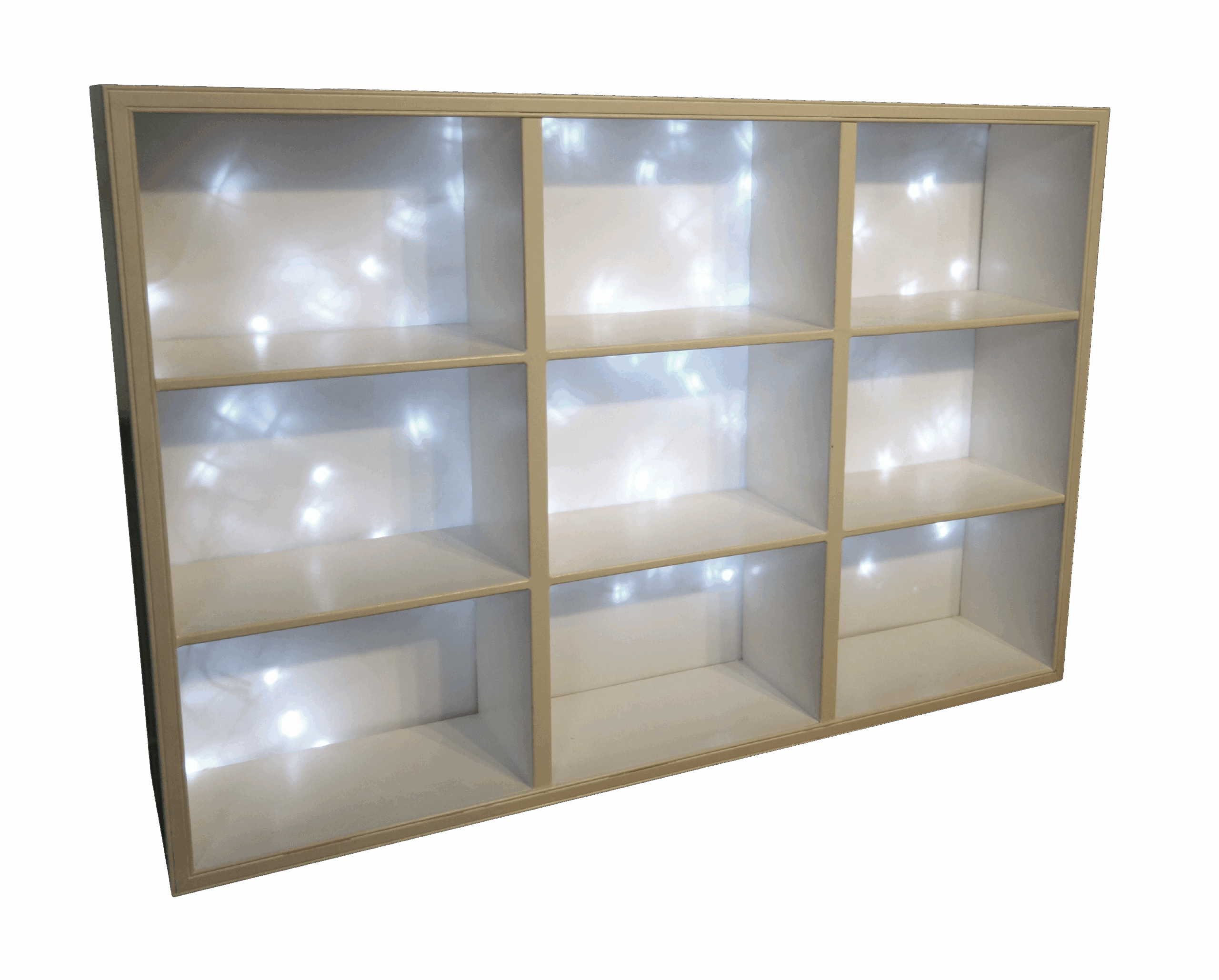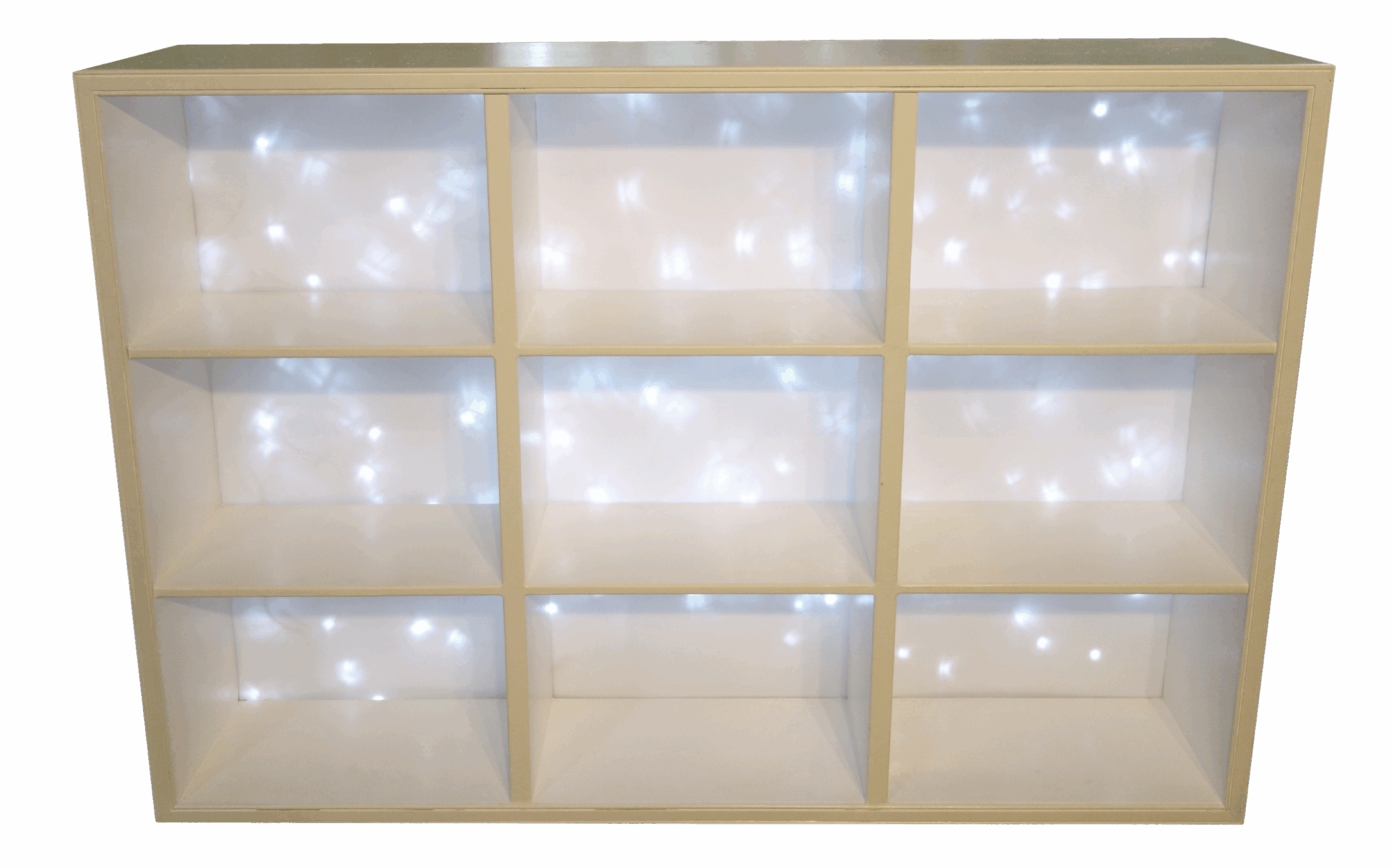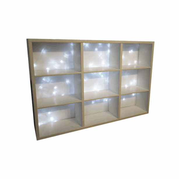 The Twinkle Lights Bar Back features cubby-style shelving with integrated LED twinkle lights that create magical starlit ambiance. This enchanting piece combines practical storage with romantic illumination for stunning bottle displays.