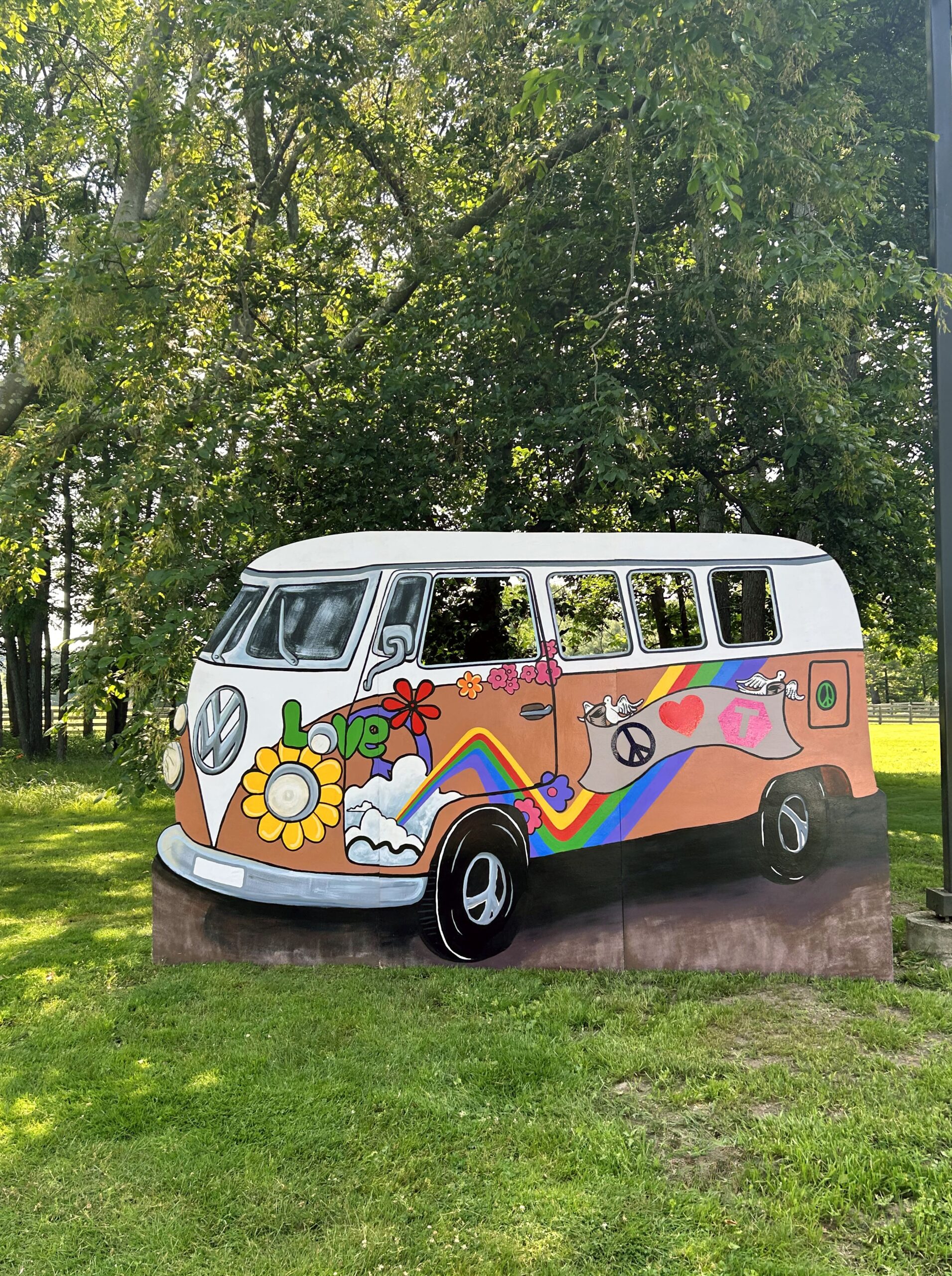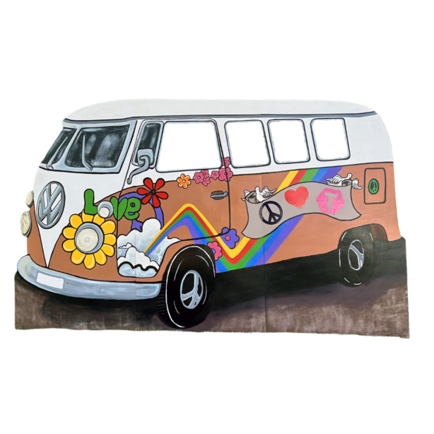 This retro VW bus photo opportunity board features iconic hippie van styling with orange and white two-tone paint, hand-painted psychedelic artwork including “LOVE” lettering, rainbow stripes, peace symbols, flower power daisy designs, doves, hearts, and colorful floral patterns, multiple window cutouts for face photo opportunities, authentic VW logo, white rounded roof, and nostalgic 1960s counterculture character, offering groovy interactive photo experiences and peace-and-love atmosphere for retro-themed celebrations and festival events.