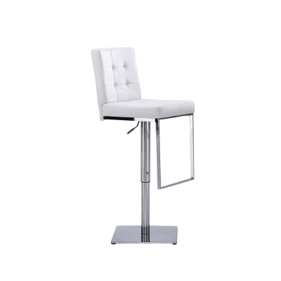 This modern white barstool features button-tufted upholstery on a sleek chrome hydraulic base with adjustable height and footrest. The plush padded seat and back provide exceptional comfort while the pristine finish adds contemporary elegance.