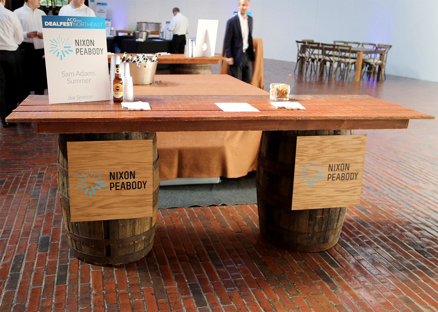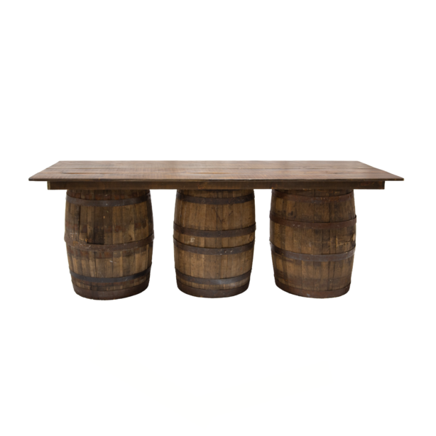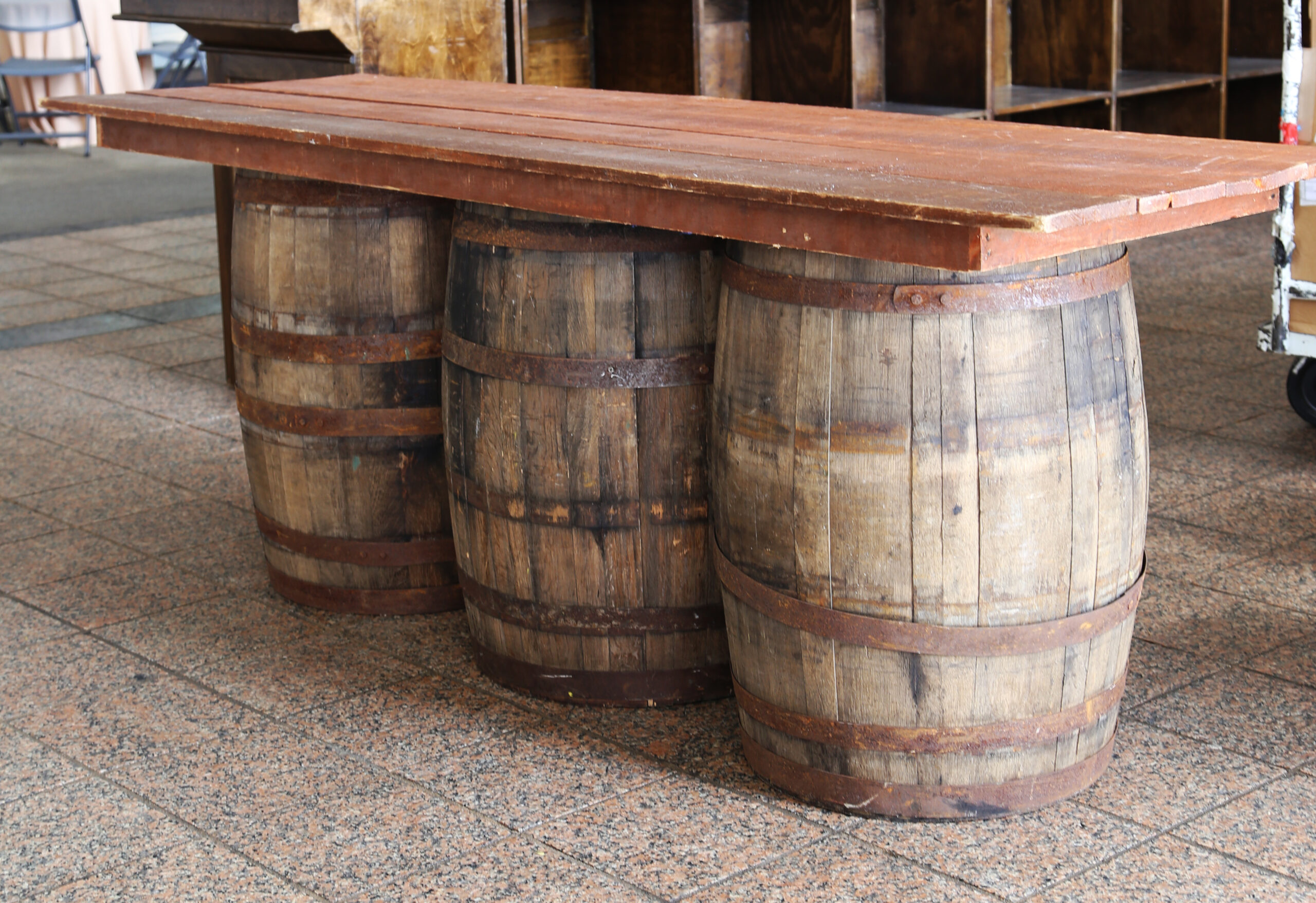 This authentic rustic bar table features genuine weathered wine or whiskey barrels as a base, topped with a rich wooden plank surface that showcases natural grain and character. The aged barrels with their distinctive metal banding and warm patina create an inviting focal point that celebrates craft beverage culture while providing a sturdy, conversation-starting surface for guests to gather around.