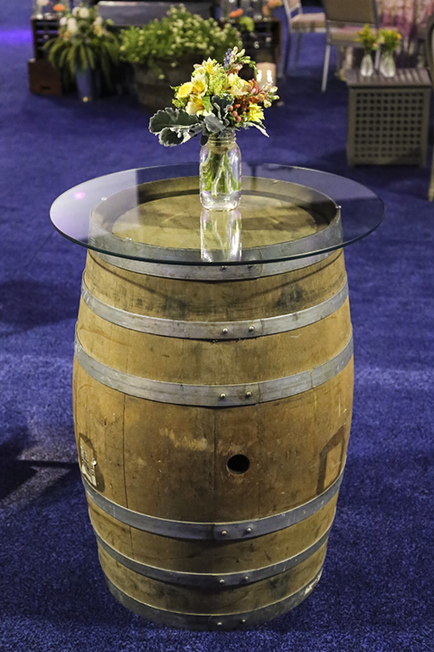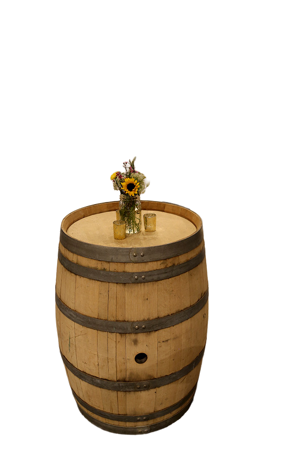 This charming rustic high top table features an authentic wine barrel base with weathered wood and distinctive metal bands, topped with a clear round glass surface. The aged barrel character and vineyard heritage create a warm, artisanal focal point perfect for wine country celebrations and rustic elegant gatherings.
