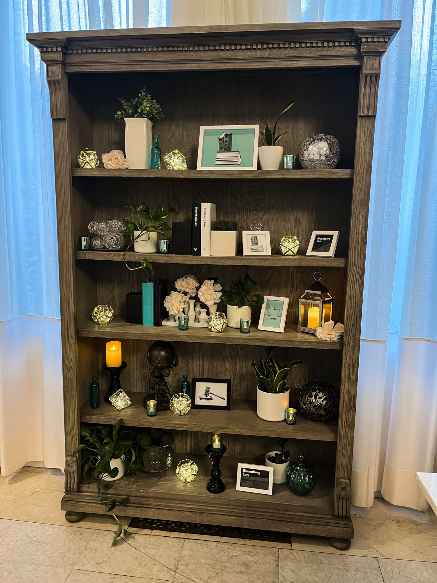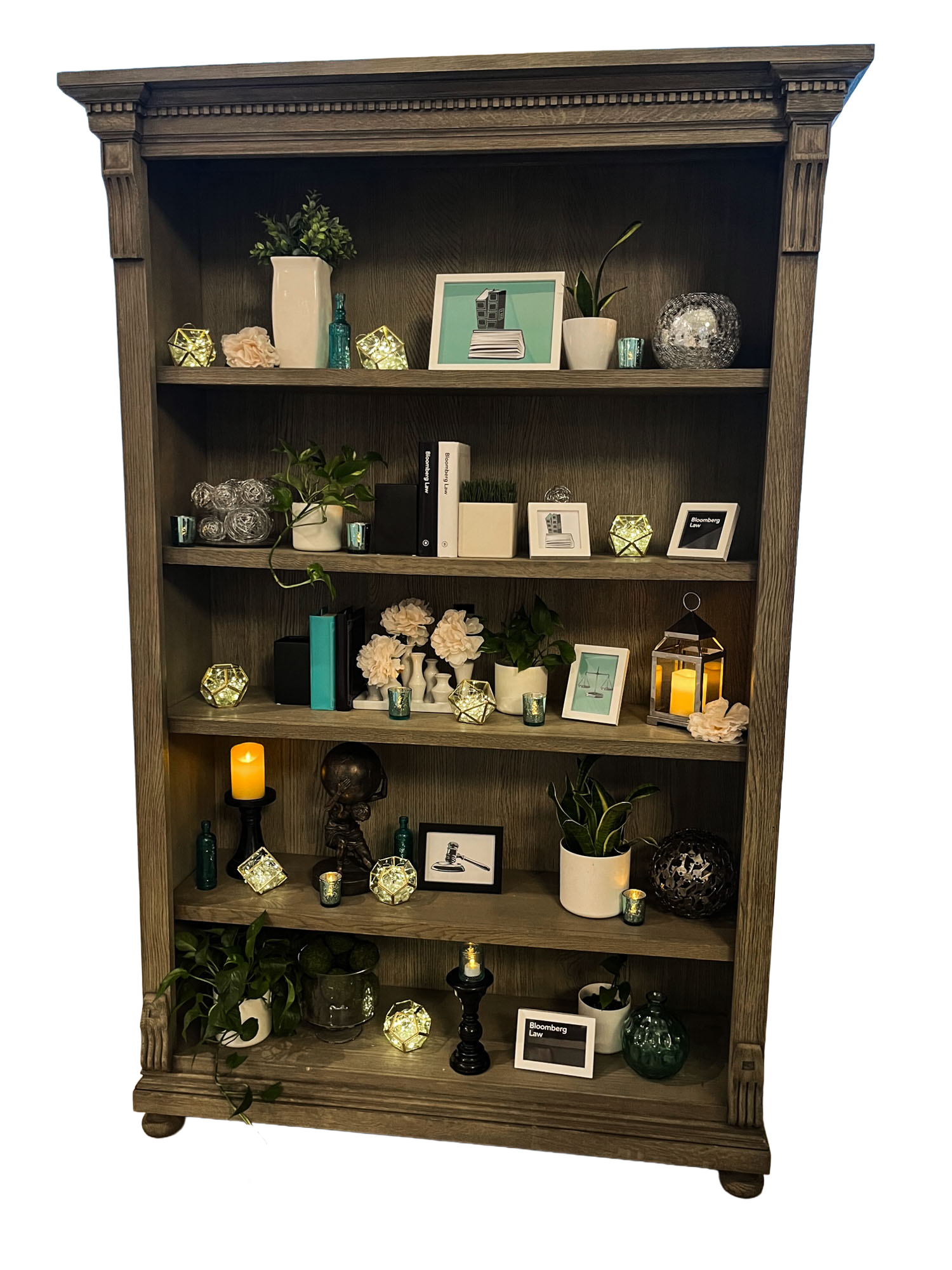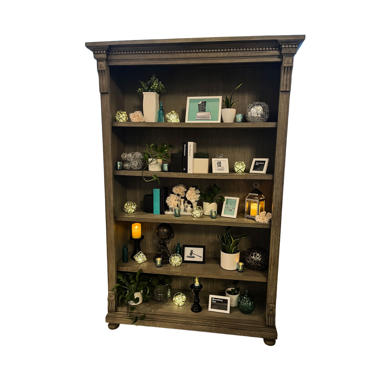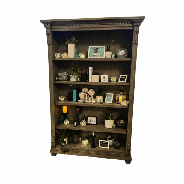 The Bookshelf Bar Back showcases refined architectural details with decorative crown molding and fluted column accents in rich weathered wood tones. Featuring five spacious shelves with a dark contrasting back panel, this stately piece creates an impressive display for premium spirits, glassware, botanicals, and curated décor while adding sophisticated depth to any bar setup.